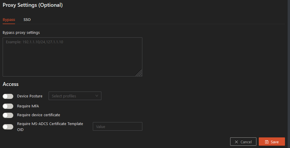 The prerequisite for this feature is an activation of Safous Agent on every device. In order for the forwarding proxy solution to work, users must be working on a device with Safous Agent installed and running. If a user disconnects, uninstalls, or logs out of the agent, s/he will not have access to applications.