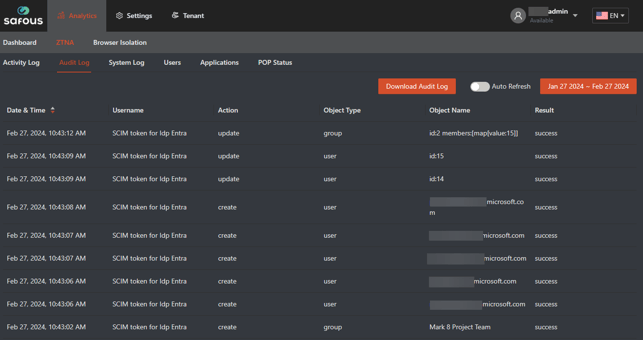 You can go to Analytics > ZTNA > Audit Log in the Admin console to find the logs events (create or update) for any change in the object. Update can mean that a user was de-activated. The number of ‘update’ messages may be larger than the number of actual changes performed in the IDP.