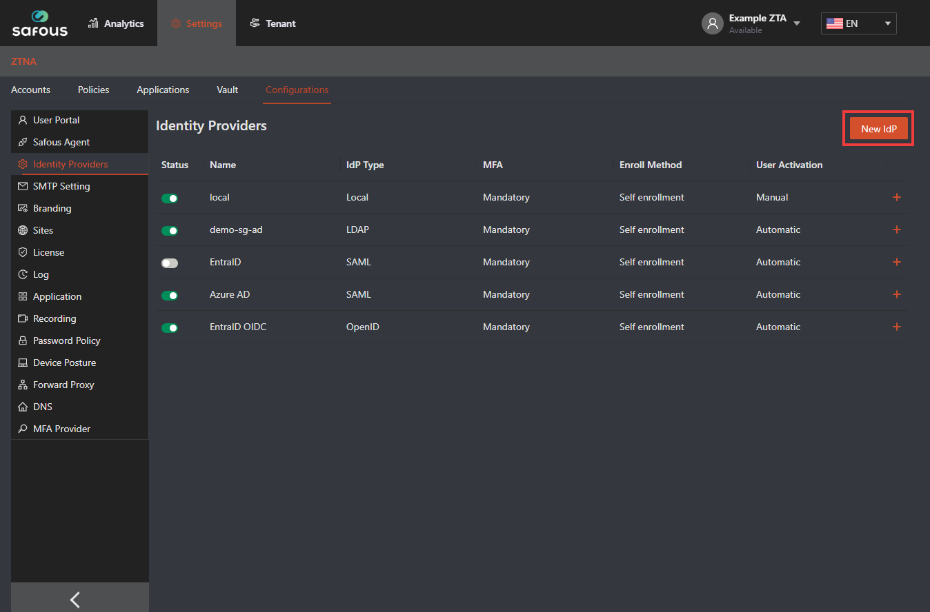 Go to Settings > ZTNA > Configurations > Identity Providers then Click on the orange button that says “New IdP”.