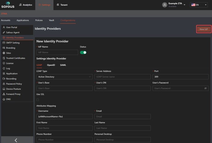 Go to Settings > ZTNA > Configurations > Identity Providers. Click New IdP, it will expand the form of IDP which you will need to configure.