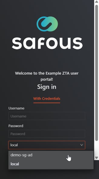- If everything is configured correctly, you can log in to the user portal (https://login.(tenant).ztna.safous.com) and choose to log in With Credential, where you will see your integrated AD option on the drop down.