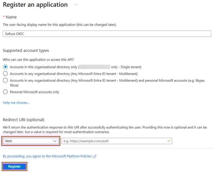 After that, set the "Redirect URI (optional)" setting to select the Web option, and then click "Register."