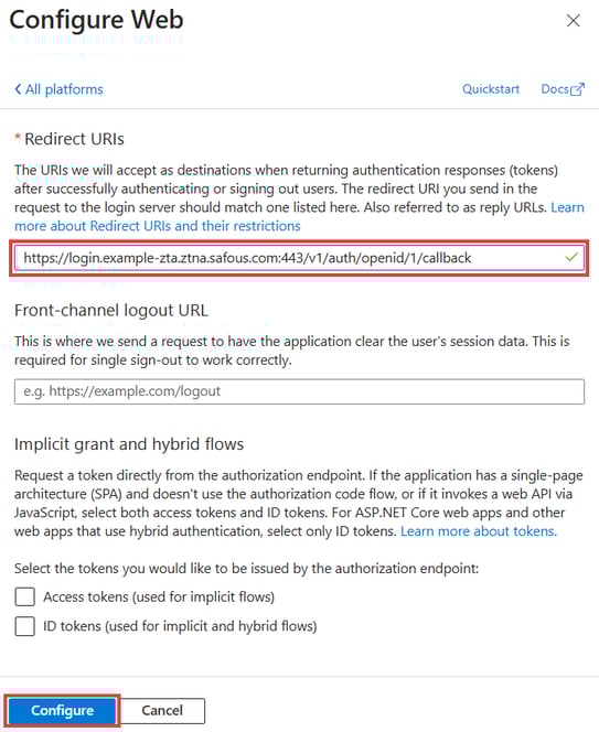 Next you need to enter the value of Redirect URIs. Enter the callback URL provided by the User Portal of your tenant (e.g https://login.tenant.ztna.safous.com:443/v1/auth/openid/1/callback). After that, click "Configure."