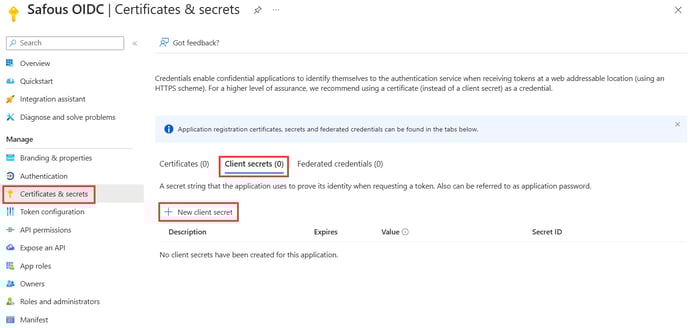 Next, navigate to the "Certificates & secrets" section. Here, you will need to create a new client secret by clicking on the "New client secret" button.