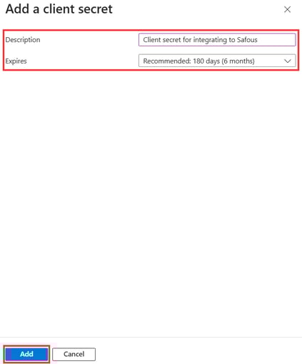 The options for creating a client secret will appear on the right side of the page. You have the option to provide a description for the client secret and select the desired expiration period for it. After making your selections, click "Add" to proceed.