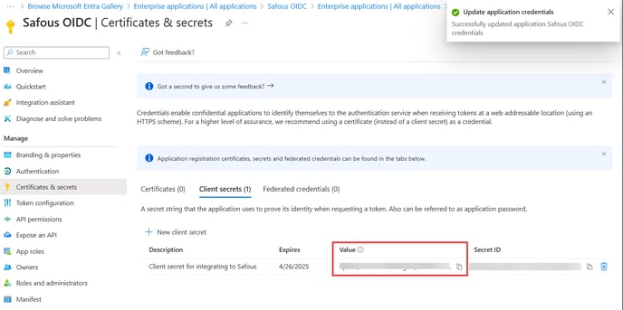 A new client secret will be generated. Please make sure to record the Value for the secret, as you will need it for the OpenID registration process in the Admin Portal later.