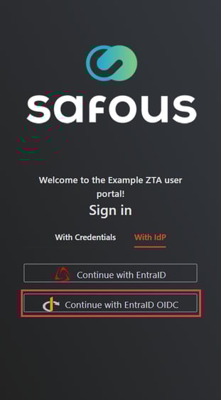If everything is configured correctly, you can log in to the user portal (https://login.tenant.ztna.safous.com) and choose to log in With IdP, where you will see the option to continue with your integrated Entra ID OpenID IdP.