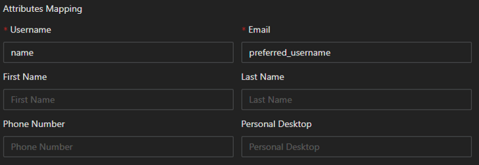 Fill in both required "Username attribute" and "Email Attribute" with supported claims such as name, preferred_username (UPN)Â and email. In this example we are using the "name" claim for the Username attribute and "preferred_username" claim for the Email attribute. You can also optionally map other attributes by matching it with available attributes in the application metadata.