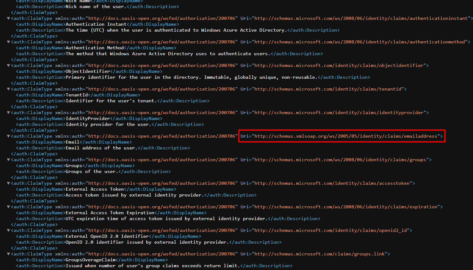 - Scroll down until you found the Claim of available attributes. Take notes of the URI of the claims that you will use (for example, URI for email claim). You can use this metadata as a reference when configuring attributes mapping on the Safous admin portal later.Â