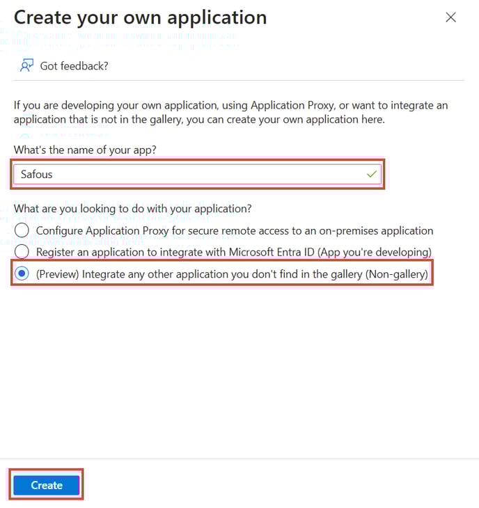 Fill the information about your app name and choose "Integrate any other application you don't find in the gallery (Non-gallery)". Then click "Create"