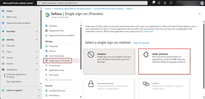 After the application has been created, navigate to "Single sign-on", then click "SAML"