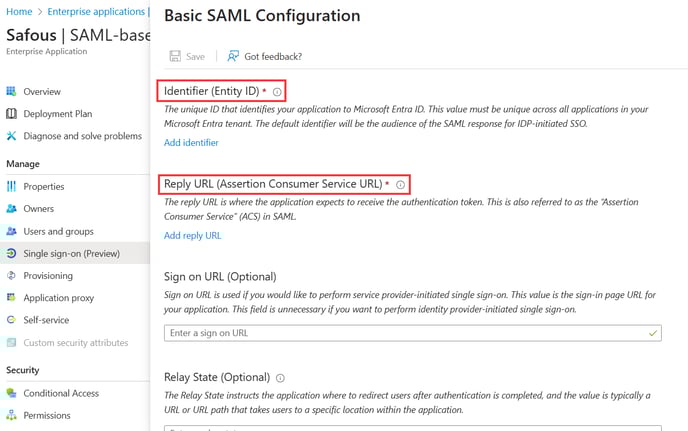If the "Redirect URI" still the same, you can leave it as is, but if it is not the same as shown in this example, you need to change the one in Entra ID to match the URI in Safous admin portal.
