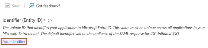 First is the Identifier (Entity ID) for the application. Click the "Add identifier" button and enter a name as the identifier for the application. Any name is acceptable as long as it's unique on your Entra ID tenant.