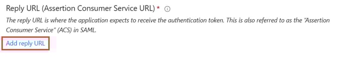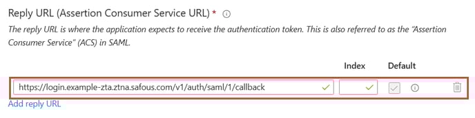 Next is the Reply URL. Click the "Add reply URL" button and enter the callback URL provided by the User Portal of your tenant (e.g https://login.tenant.ztna.safous.com/v1/auth/saml/1/callback).Â