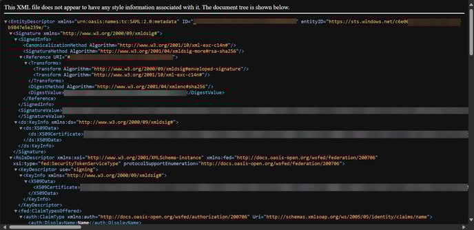 - Open in your browser and paste the link so it will open the XML metadata for Entra ID attribute Claim