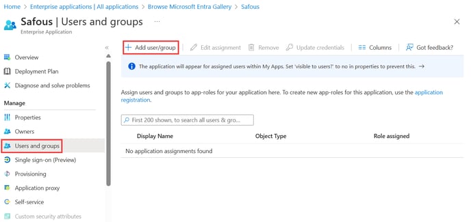 - Select the users and/or groups you wish to assign to the application. Keep in mind that only these designated users and groups will have access to the Safous ZTA User Portal after the integration is complete.