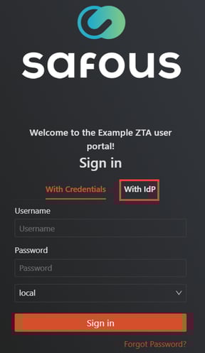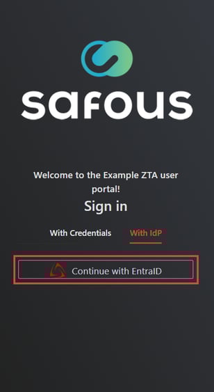 If everything is configured correctly, you can log in to the user portal (https://login.tenant.ztna.safous.com) and choose to log in With IdP, where you will see the option to continue with your integrated Entra ID SAML IdP.