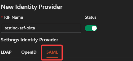 - Choose SAML for the Identity Provider Setting.