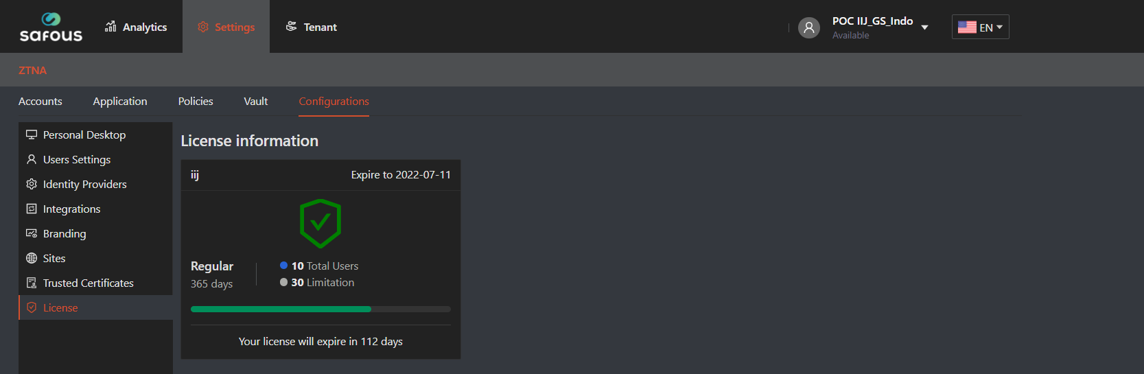 - Navigate to Settings > ZTNA > Configurations > License