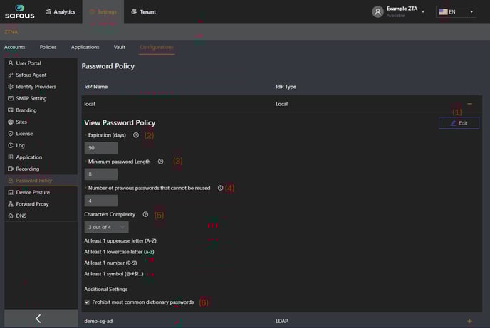 Expiration (days): Configure the password expiration policy in days. The default setting is 90 days, but this can be adjusted to any value from 0 (indicating that the password will never expire) up to a maximum of 999 days.