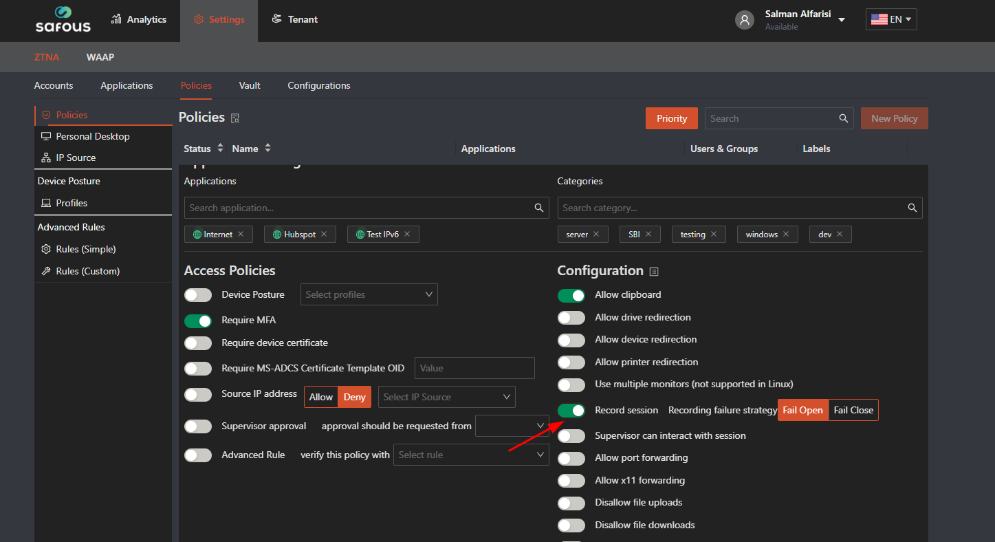 - Fail-Open Configuration (default): If there is insufficient space for recording, users can still access the application, but their sessions will not be recorded. Audit logs will note the session as accessed but not recorded.