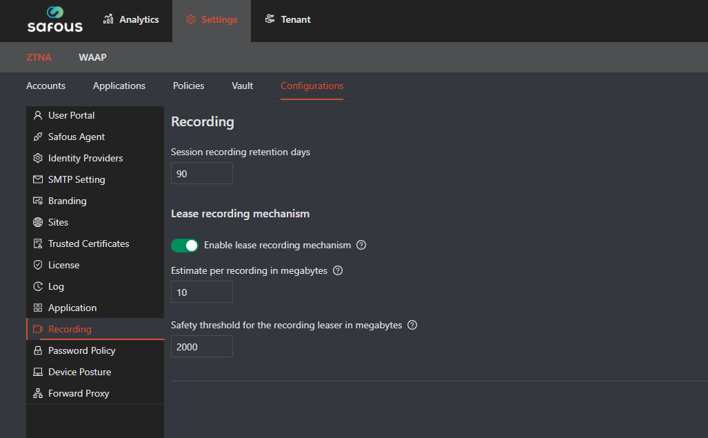 Settings > ZTNA > Configuration > Recording. - Configure the following fields: