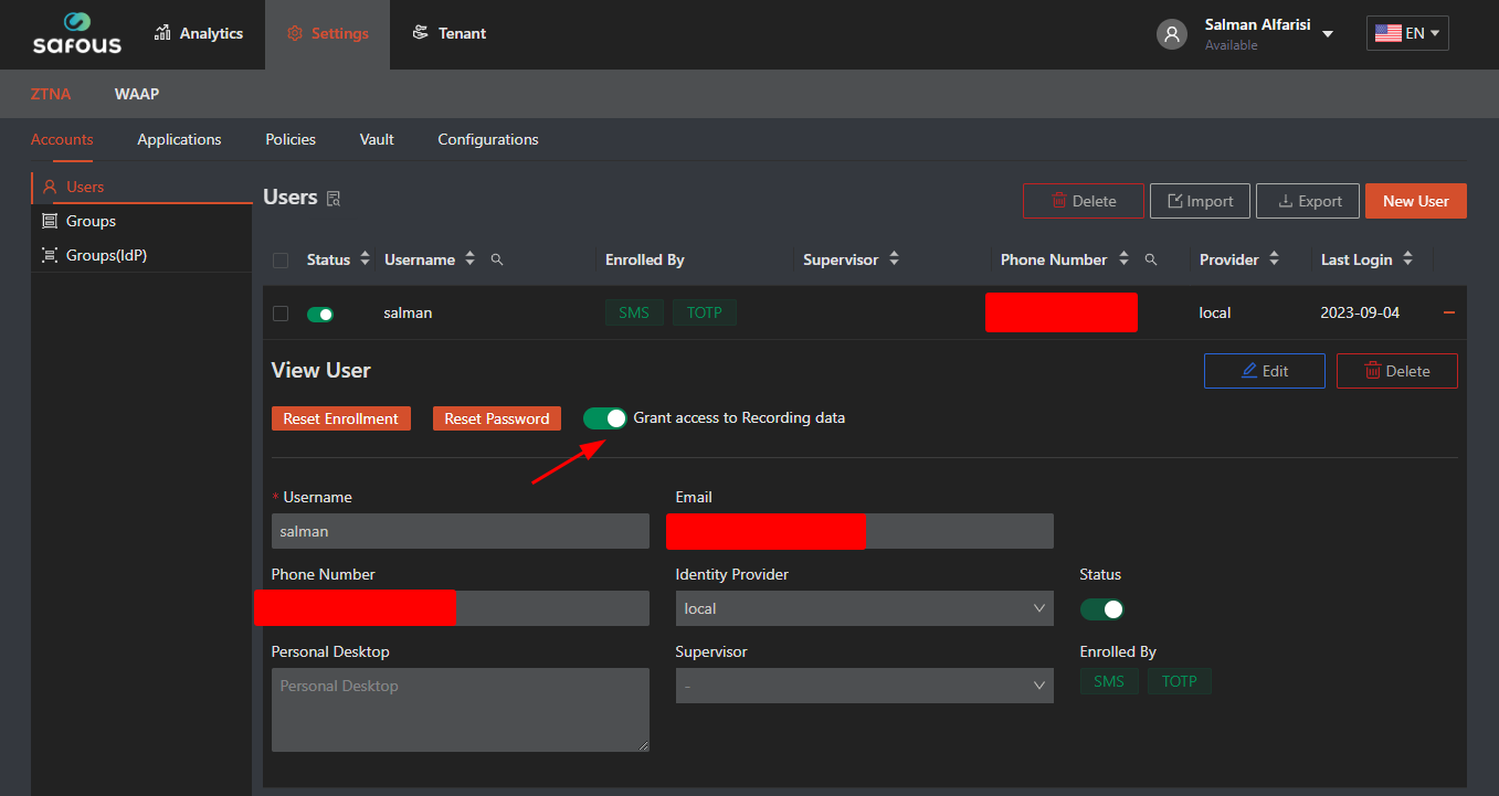 When you activate recording sessions, all sessions that are recorded for those users are recorded and stored. In the Settings > ZTNA > Account you can specify which users can access the Recordings.