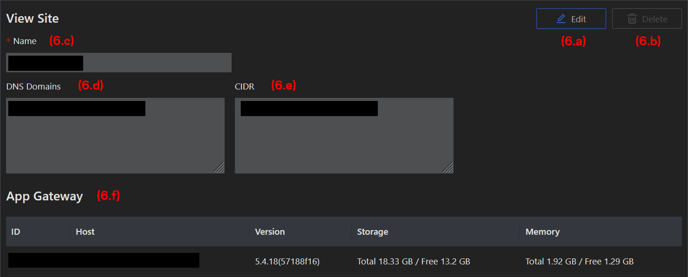 6.b) Delete, click this button to remove the site. To be able to remove the site, you need to terminate the App Gateways inside the site and delete all the site's configurations. The site needs to be empty to be removed.