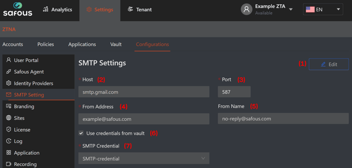 This page explains detailed configuration parameters of Settings > Configuration > SMTP Setting on the Safous admin portal (portal.safous.com)