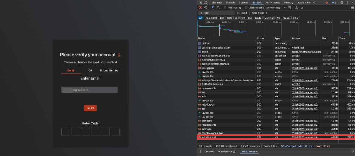 initiate-email returned error with status code 500: Check the SMTP settings in the admin portal and ensure it is correctly configured.