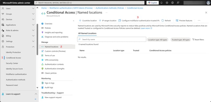 - Select "Configure MFA trusted IPs" in the bar across the top of the Conditional Access | Named Locations window.