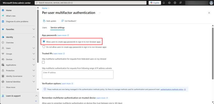 - On the Per-user multifactor authentication page, click Service settings and select the "Allow users to create app passwords to sign in to non-browser apps" option.