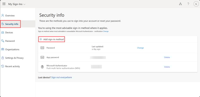 - Select Security info from the left navigation pane or from the link in the Security info block, and then select Add sign-in method from the Security info page.