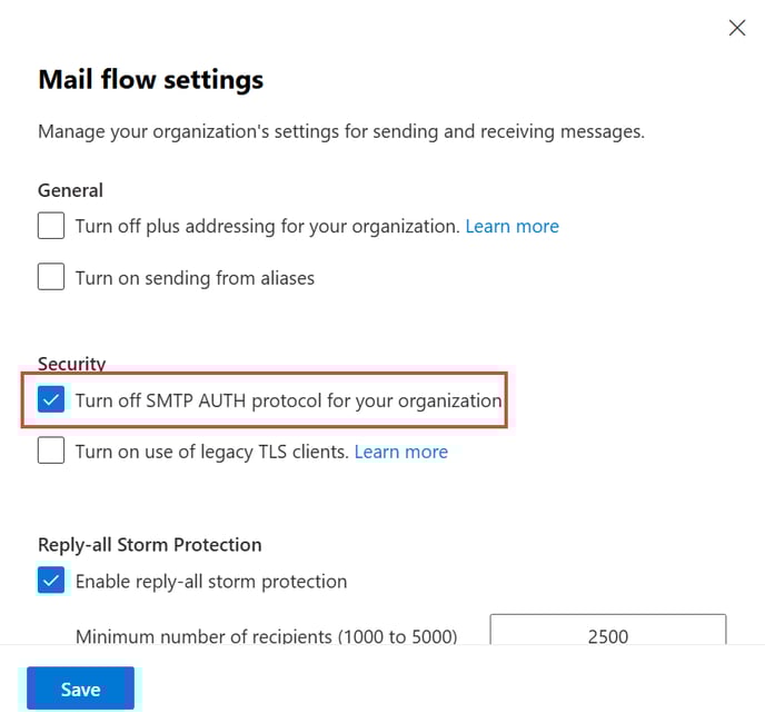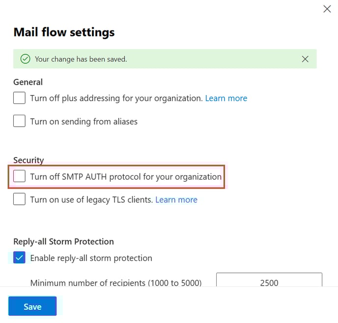 - On the security section, uncheck the "Turn off SMTP AUTH protocol for your organization" option.