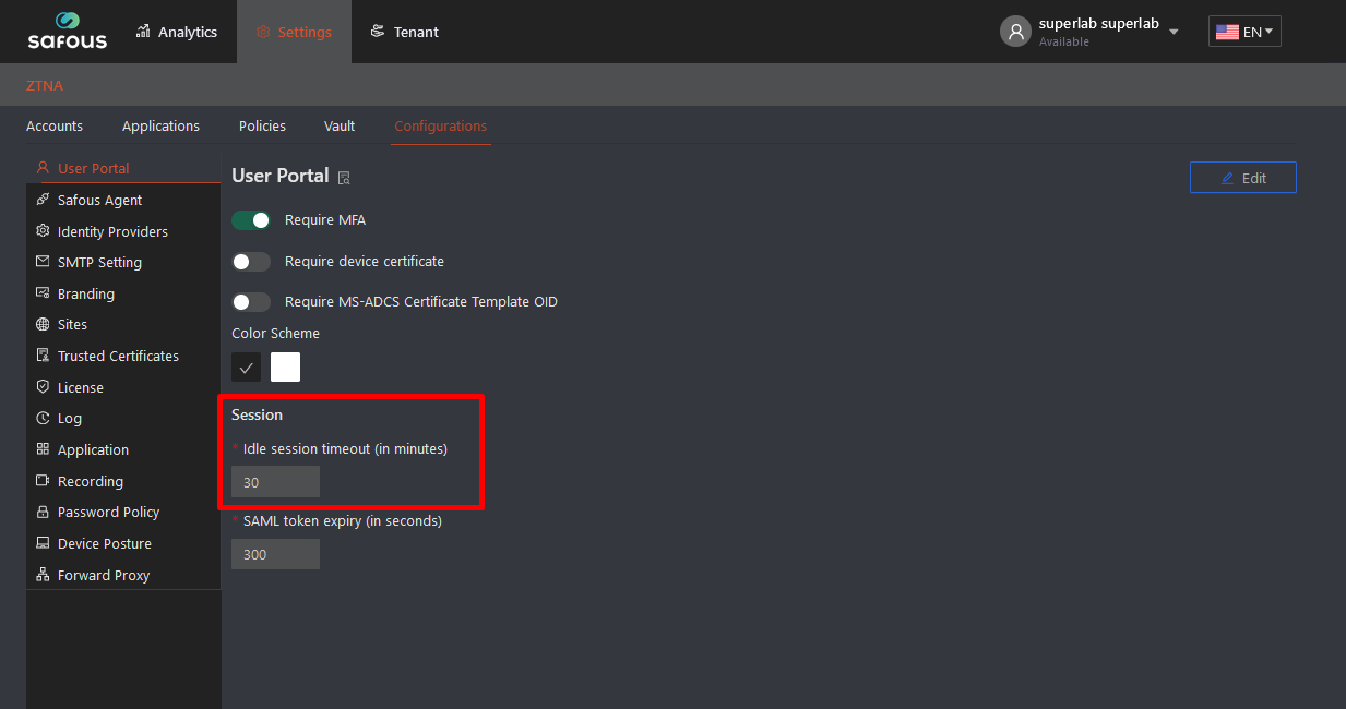 Web-based protocols include HTTP/S, RDP web, SSH web, VNC web, Telnet web, or SMB. Administrators can configure the amount of time a web-based session is active in the Admin Portal, Settings > ZTNA > Configurations > User Portal, under the Session block in the “Idle session timeout” field as noted in the screenshot below: