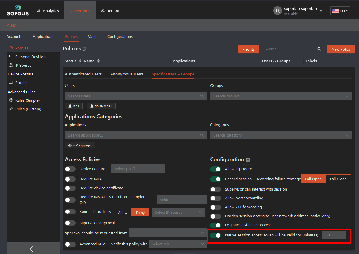 However, Administrators can configure native protocol (Native RDP and Native SSH but NOT network access via the agent policies), setting the amount of time users have to connect to the server once they click the tile for that application. This can be configured in the Admin Portal, under Policies in the “Native session access token will be valid for (minutes)” field as noted in the screenshot below: