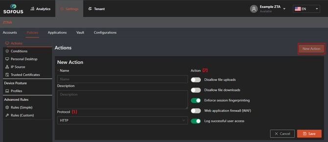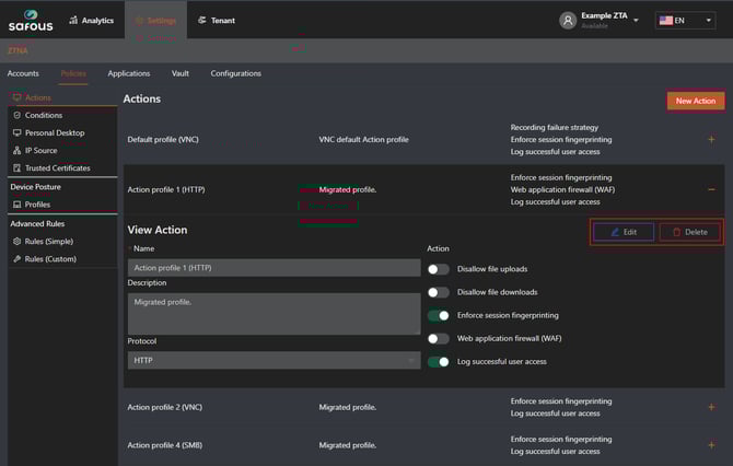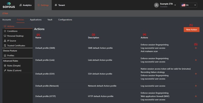 Actions makes it easier for administrators to configure specific capabilities and then bind them to applications. Actions has different types of configuration on each application or protocol type: HTTP, HTTPS, RDP, SSH, VNC, TELNET, SMB, Network, SaaS, and Link.Â