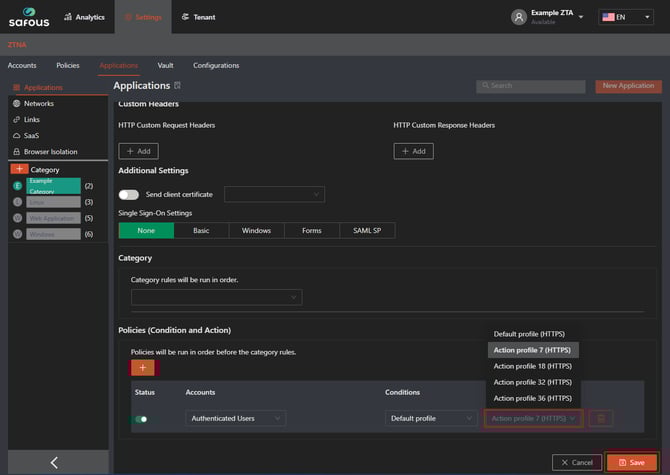 - In the Admin Portal, go to the Application page (Settings > ZTNA > Applications) and select the application where the action should be applied. You can either create a new application or edit an existing one.