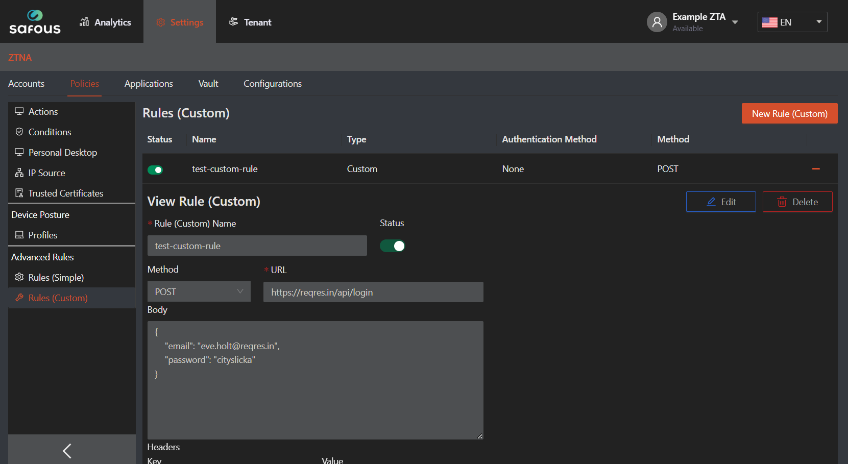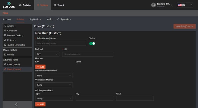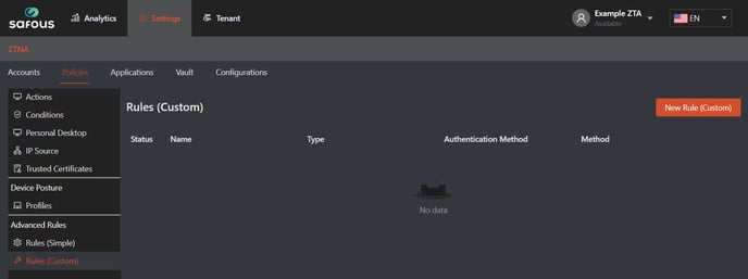 - Navigate to Settings > ZTNA > Policies > Rules (Custom) > New Rules (Custom)