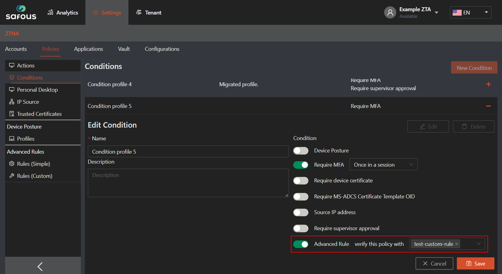 - After creating an Advanced Rule (Custom), you can apply it in conditon Conditions. Navigate to Settings > ZTNA > Policies > Conditions, it will expand all the option for policy that can be use for application authorization. Fill out condition name and the advanced rules that are used in this condition.Â