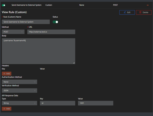 Enter the Rule (Custom) name, select POST as Method, and enter the URL.