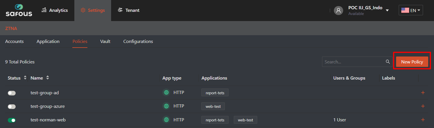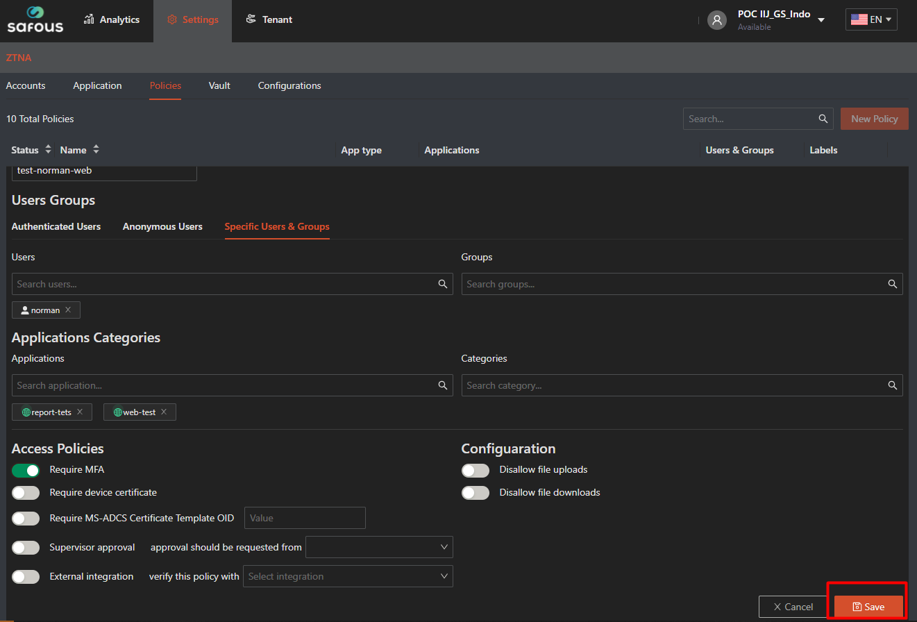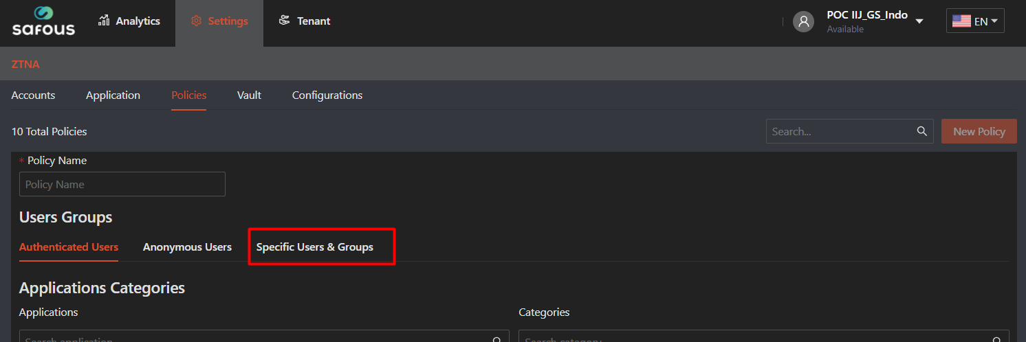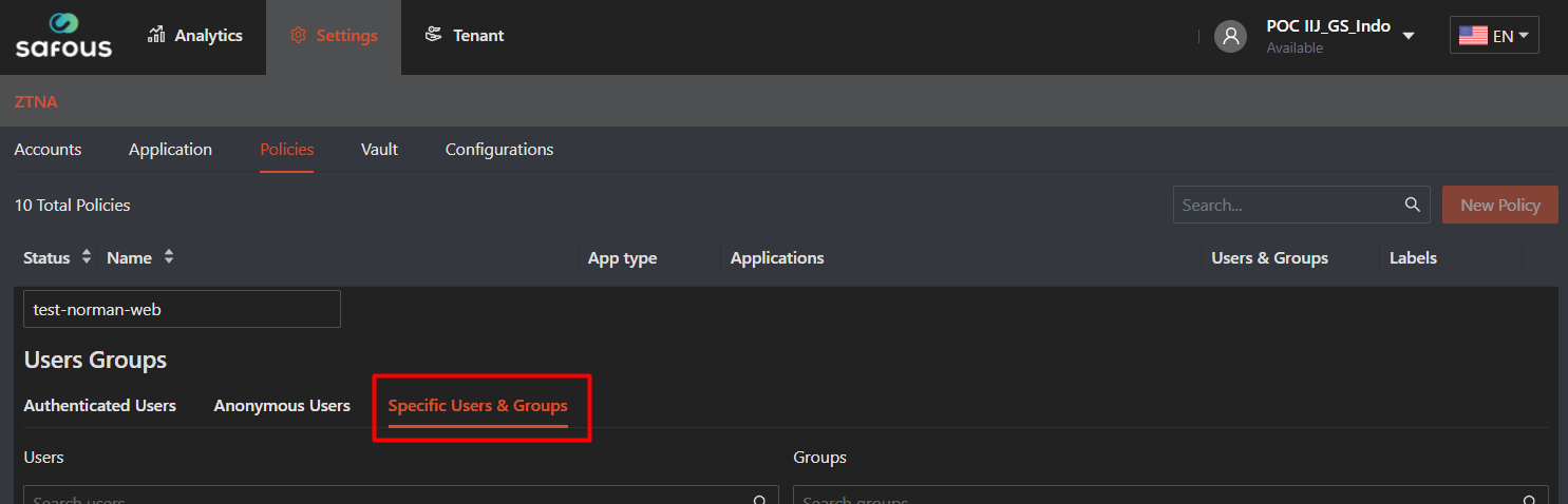 - For this time we're focusing on how to create policy which can be accessed by specific users and/or groups for specific app, so on "Users Groups" click on "Specific Users & Groups"
