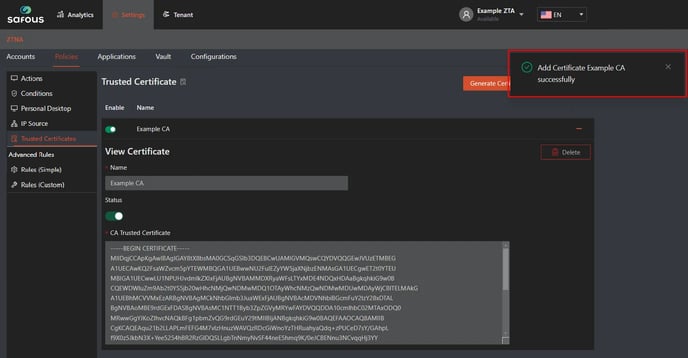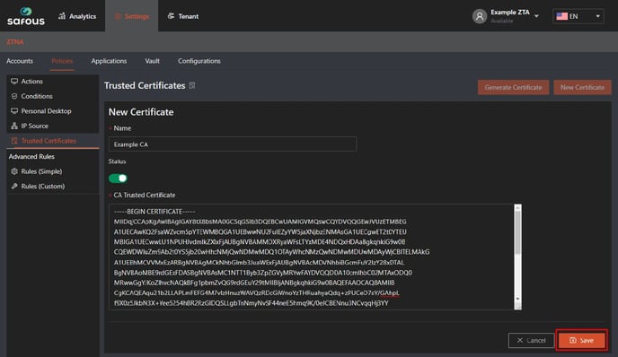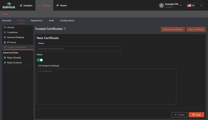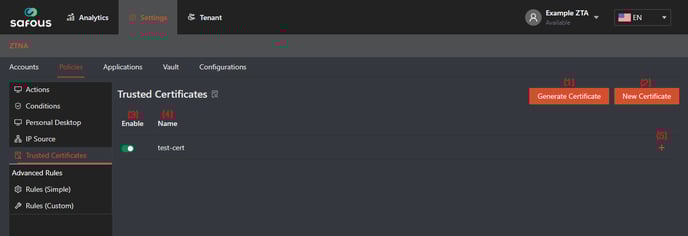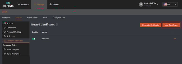 - Navigate to Settings > ZTNA > Policies > Trusted Certificate