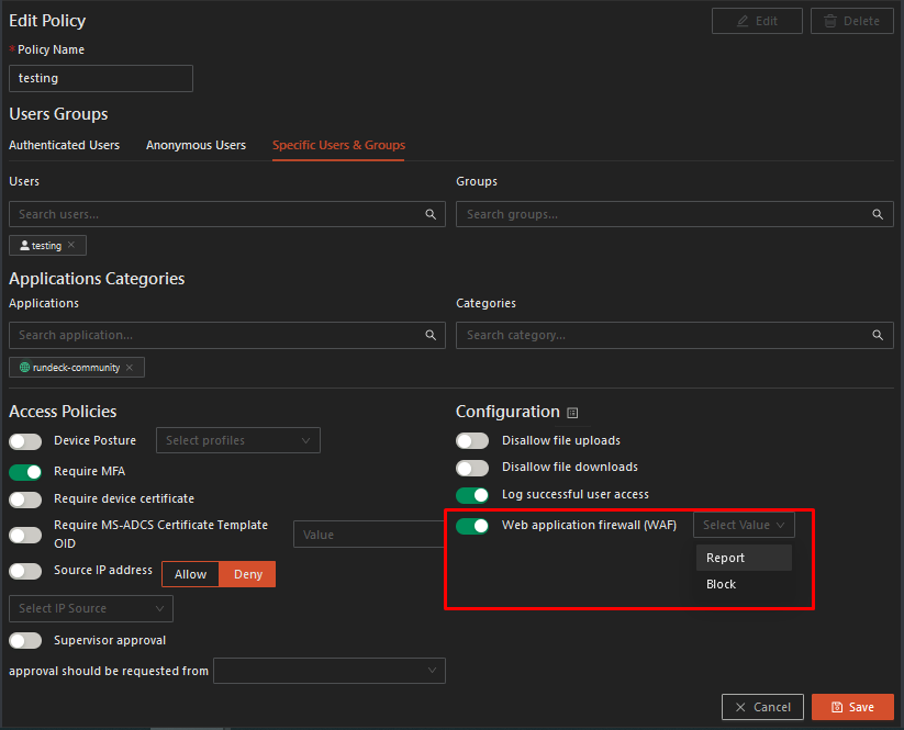 The OWASP Top 10 is a standard awareness document that represents a broad consensus about the most critical security risks to web applications. The most recent OWASP Top Ten list was published in 2021 categorizing and listing the 10 most critical web application security risks. Safous ZTA platform adopted OWASP’s most recent top ten protections as noted here, and the feature is configurable in the Policy screen as noted below (WAF option only available once the web-application is put into the Applications field).