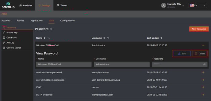 - Click Edit to modify, or Delete to delete the password.Â