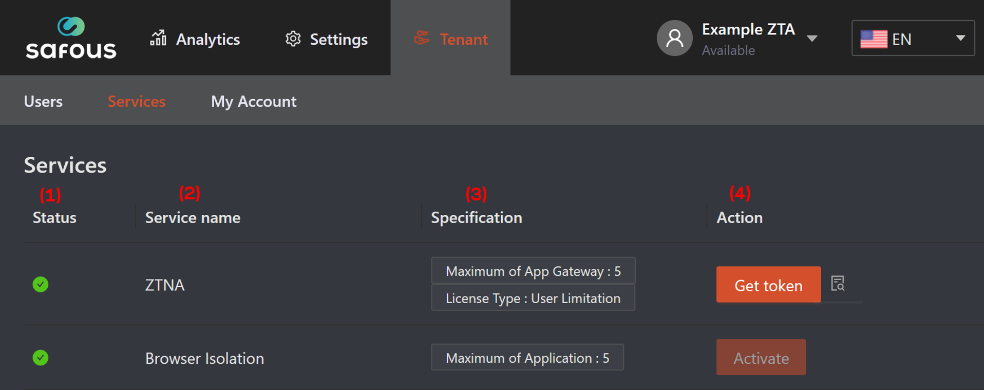 Action, this column shows what kind of action available for the service. For ZTNA, you will be able to get installation token when clicking the Get token button as long as the quota for App Gateways is still available (depends on the permission). For Browser Isolation, you will be able to activate the service when clicking the Activate button (depends on the permission).
