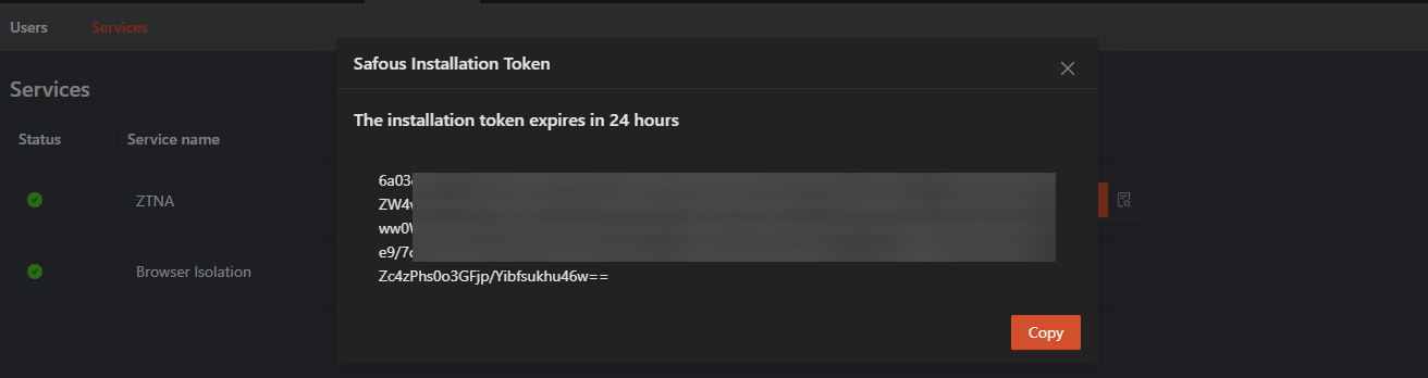 Once you have clicked the Get Token button, Safous will generate Safous Installation Token needed for the installation of App Gateway and display it on the browser tab.