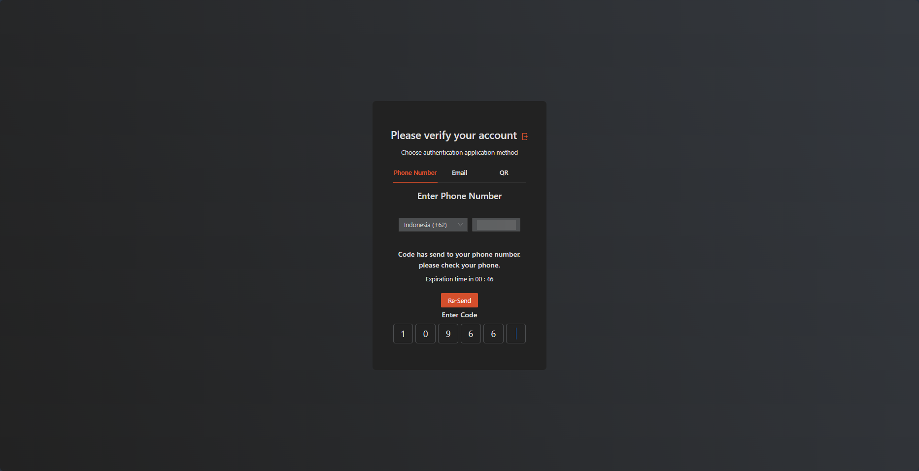 If you choose Phone Number for MFA method, then you need to input your phone number country code and the rest of your phone number. Once you click send, the OTP will be sent via SMS to your number.