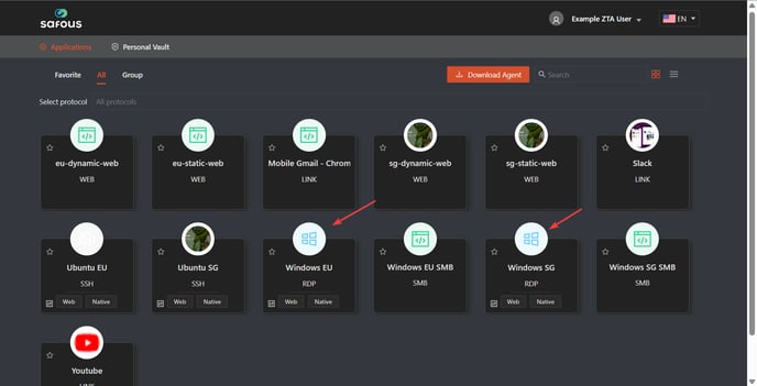 After logging into the user portal, you will see a list of accessible applications, which includes the RDP-based App that you have created. You can select the access method you prefer, either through the web or a native RDP client.Â